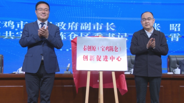 市政府副市長張昭、區委書記馬霄共同為秦創原(寶雞陳倉)創新促進中心揭牌。區長馬小鋒主持會議。
