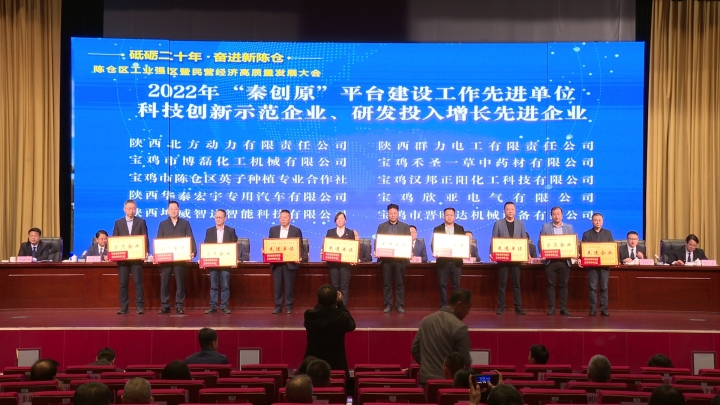 會議通報表彰了2022年度陳倉區工業強區建設先進單位和2022年度科技創新工作先進單位。陜西耀威銅業有限公司、寶雞育才玻璃(集團)有限公司分別榮獲工業強區特別貢獻獎和20萬元獎勵。青島啤酒寶雞有限公司、陜西北方動力有限公司等45戶企業分別榮獲工業穩增長、技改投資和科技創新先進企業。區工信局、招商局、住建局、農業農村局榮獲重點產業鏈建設先進單位。