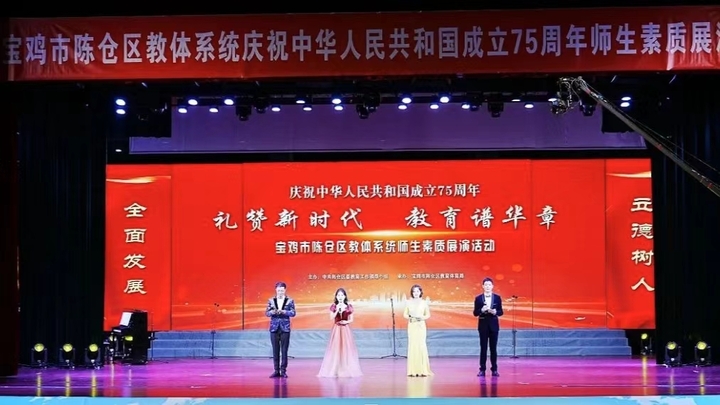 9月29日,由中共寶雞市陳倉區委教育工作領導小組主辦,陳倉區教體局承辦的慶祝中華人民共和國成立75周年“禮贊新時代教育譜華章”陳倉區教體系統師生素質展演活動在區政府劇院舉行。寶雞市教育局黨組成員李天讓,區領導裴振強、茍曉明、柳鵬舉、劉博彥、徐宏剛、閆海艷、齊曉輝、王曉妮參加活動。