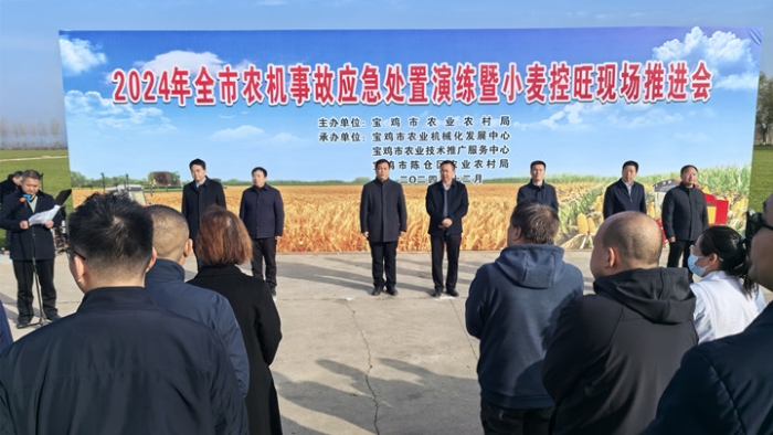 12月6日,2024年全市農機事故應急處置演練暨小麥控旺現場推進會在陳倉區慕儀鎮洞坡村利民無人農場召開。市農業農村局副局長張銳平參加活動,區政府副區長楊利剛代表區委、區政府致歡迎辭。